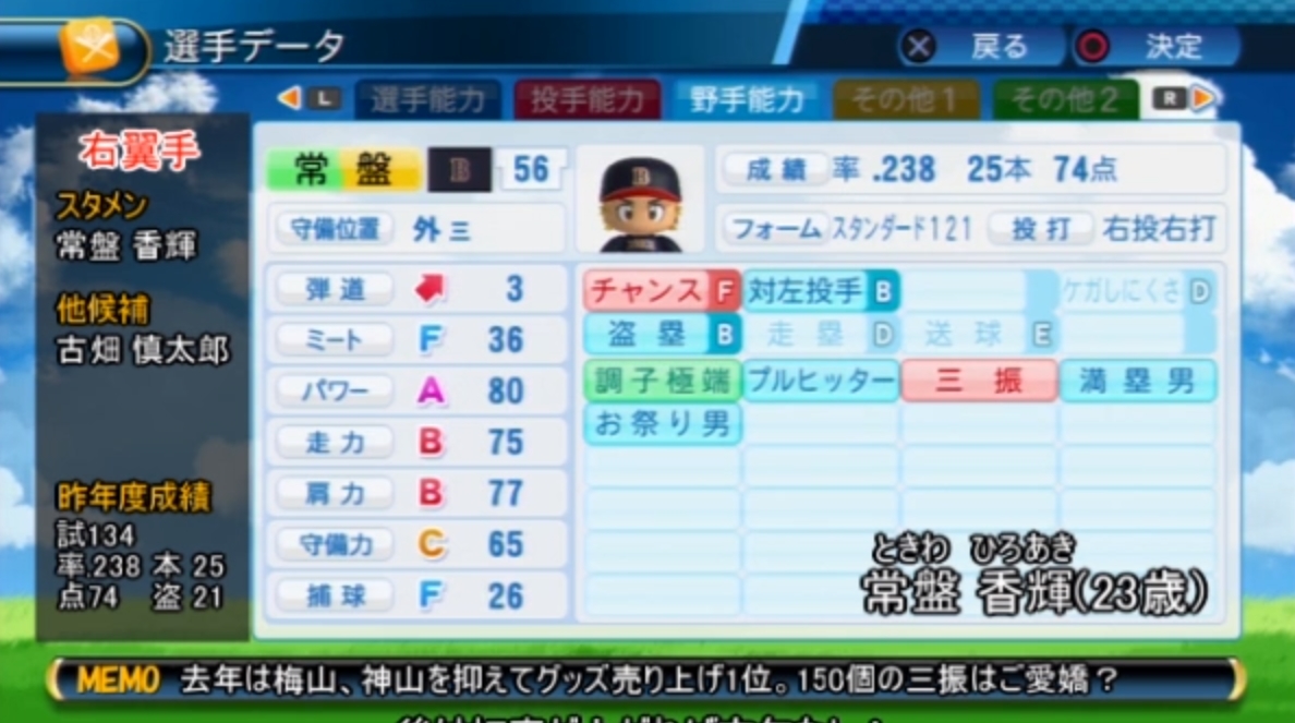 ②版では、作品初期のチャンスに強い常盤を再現するために、チャンスはEに。しかしサヨナラ男を付与してバランスをとっています。